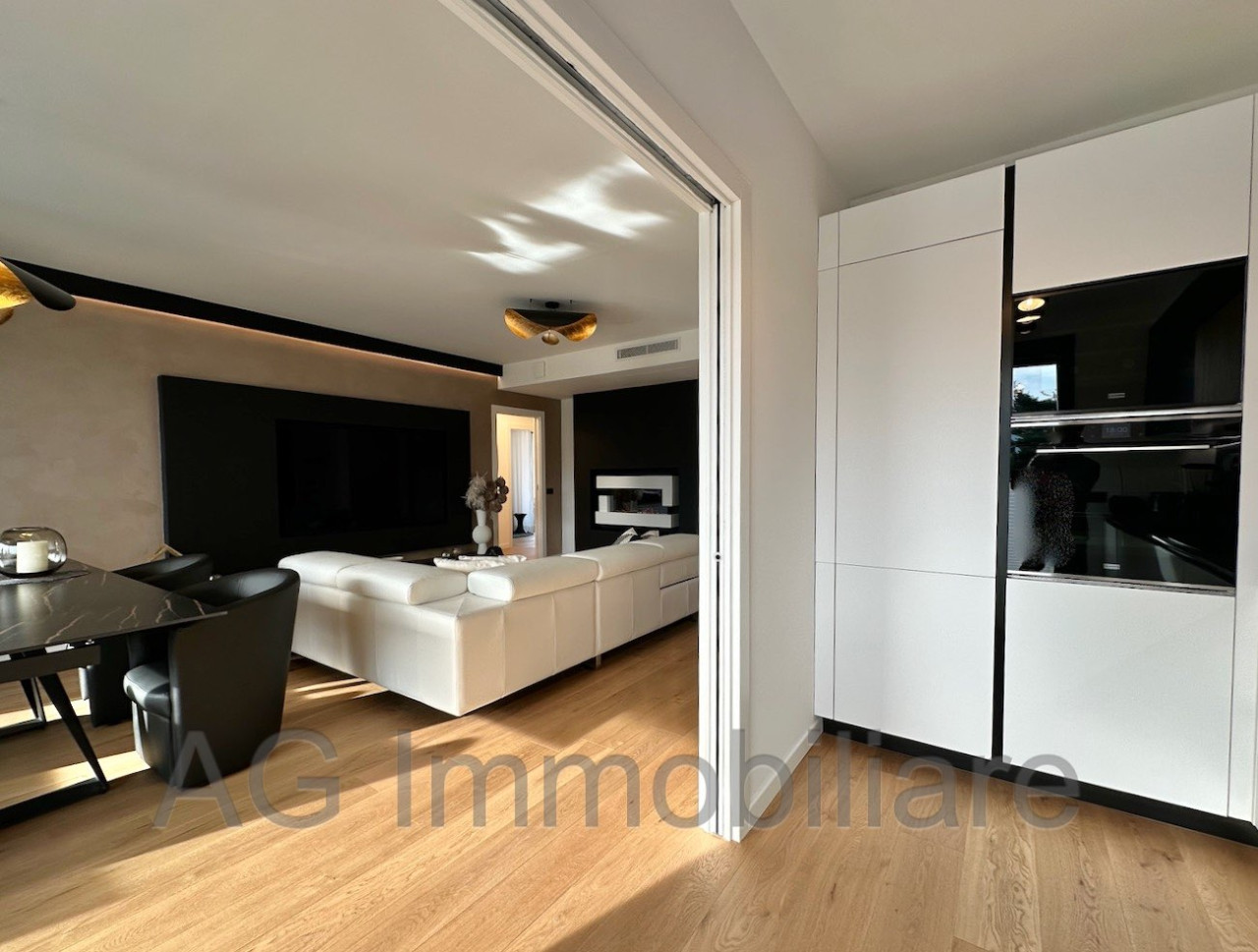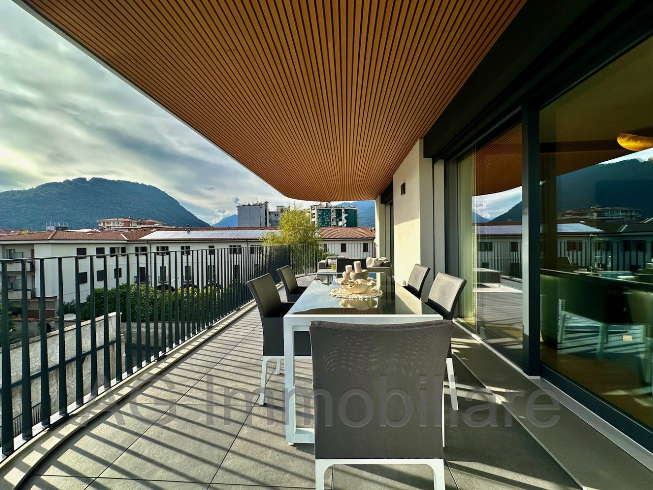 Die Wohnung befindet sich im vorletzten Stockwerk, ist mit einem Aufzug erreichbar und setzt sich wie folgt zusammen: Eingang in ein wunderschönes, großes Wohnzimmer, das durch ein großes Fenster beleuchtet wird und Zugang zur herrlichen, vollständig überdachten Außenterrasse bietet, von der aus man einen wunderschönen Blick auf die Altstadt und einen Teil des Sees hat. Aufgrund ihrer imposanten Größe bietet die Terrasse Platz für einen Tisch für sechs bis acht Personen und einen Sitzbereich, in dem man sich mit Freunden entspannen und bei einem Mittag- oder Abendessen im Freien das herrliche Panorama genießen kann.